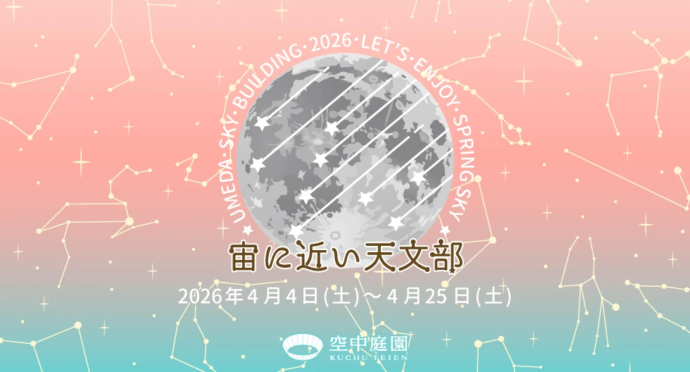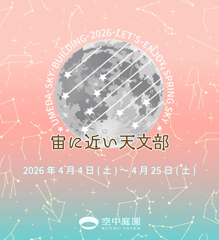 チケット 団体 NEWS 空中庭園展望台 営業時間 9:30〜22:30(最終入場22:00) ※特別営業はこちらからご確認ください ハートロック購入をご検討のお客様へ WEBチケット購入はこちら 開催中・開催予定のイベント情報 2026年4月4日(土)~4月25日(土) 宙(そら)に近い天文部 2026年4月の天体イベントスケジュール 2026年3月19日(木)~4月12日(日) 『映画 えんとつ町のプペル ~約束の時計台~』公開記念 パネル展 & プレゼントキャンペーン! 2026年3月28日(土)~4月5日(日) しぐれうい in 梅田スカイビル オリジナルコラボグッズも登場! 常時チャレンジ可能 お子さま向けクイズラリー「スカイクエスト」 新梅田シティを歩きまわろう! MORE 施設案内 空中庭園展望台 39-40F, 屋上 MORE ショップ・レストラン タワーイースト 39F MORE 昭和レトロ商店街滝見小路 B1~1F MORE WILLERバスターミナル大阪梅田 タワーイースト 1F MORE テアトル梅田 タワーイースト 3-4F MORE 展示会場・貸会議室 タワーウエスト 22,36F,他 MORE クリニック タワーイースト 7F MORE 絹谷幸二 天空美術館 タワーウエスト 27F MORE 魅力発見 梅田スカイビルには、まだまだお伝えしたい魅力がいっぱい! 知れば知るほど楽しめる「梅田スカイビル」の “魅力”を少しずつご紹介していきます。 MORE ランドスケープ 花野〜新・里山〜/希望の壁/中自然の森 梅田スカイビルのある新梅田シティには、四季折々の風景に出会えるランドスケープが。春の桜・秋の紅葉など、季節ごとに移り変わる自然とふれあって。 MORE ガイドツアー 普段は入ることのできない場所も巡りながら梅田スカイビルをより深くお楽しみいただけます。 建築とアートに特化した大人のガイドツアーをはじめ見学の目的に合わせてアテンダーが丁寧にご案内します。 MORE PAGE TOP