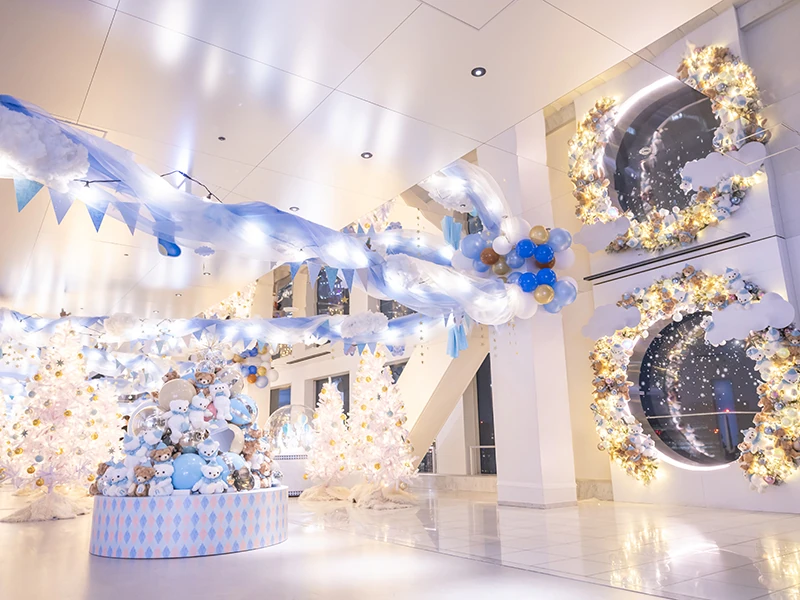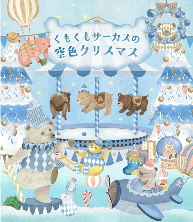 ふわふわ浮かぶ雲、星のように輝くライト、そして空を旅する気球を準備し、くまのサーカス団は空へと旅立ちました。