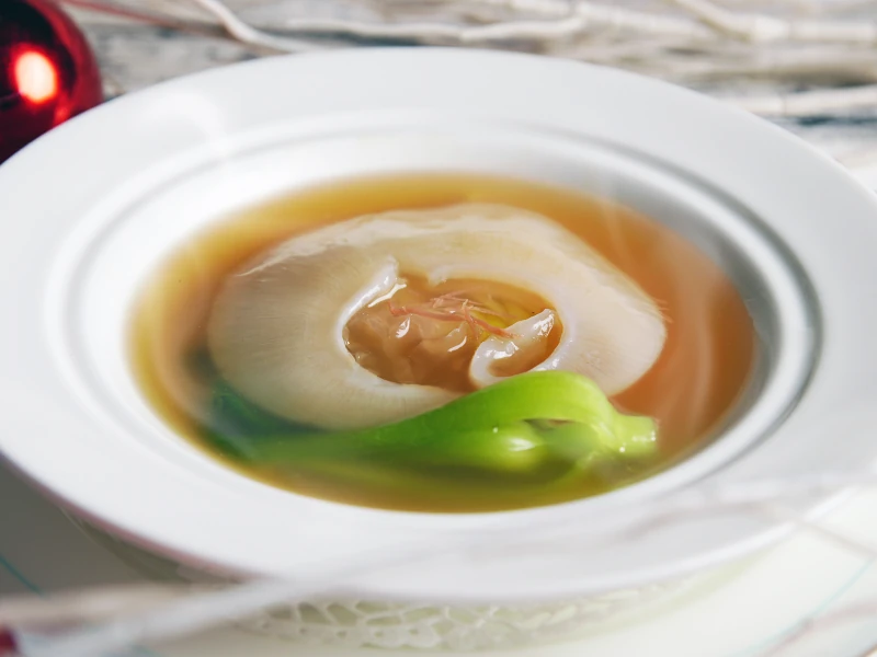 熟練の職人により、一つひとつ手作業で皮や骨を取り除き、低温で栄養を壊さず旨みを増しながら乾燥させたフカヒレを手間暇を惜しまず、ゆっくりと時間をかけてもどし、創業当時より受け継いできた中国料理のベースとなる上湯スープで煮込み、旨みを加えます。