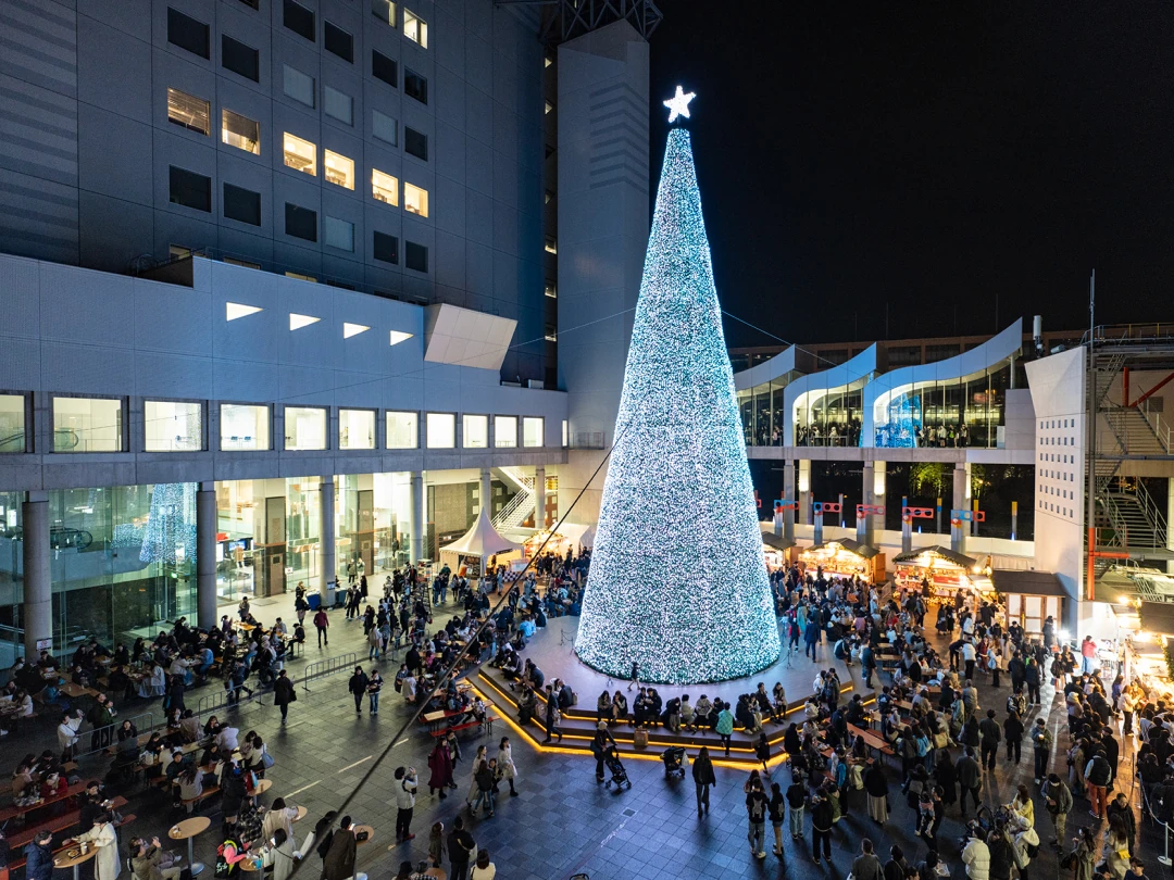 広場中央にそびえたつのは、高さ25m、約13万球のLEDに覆われた圧巻のクリスマスツリー。