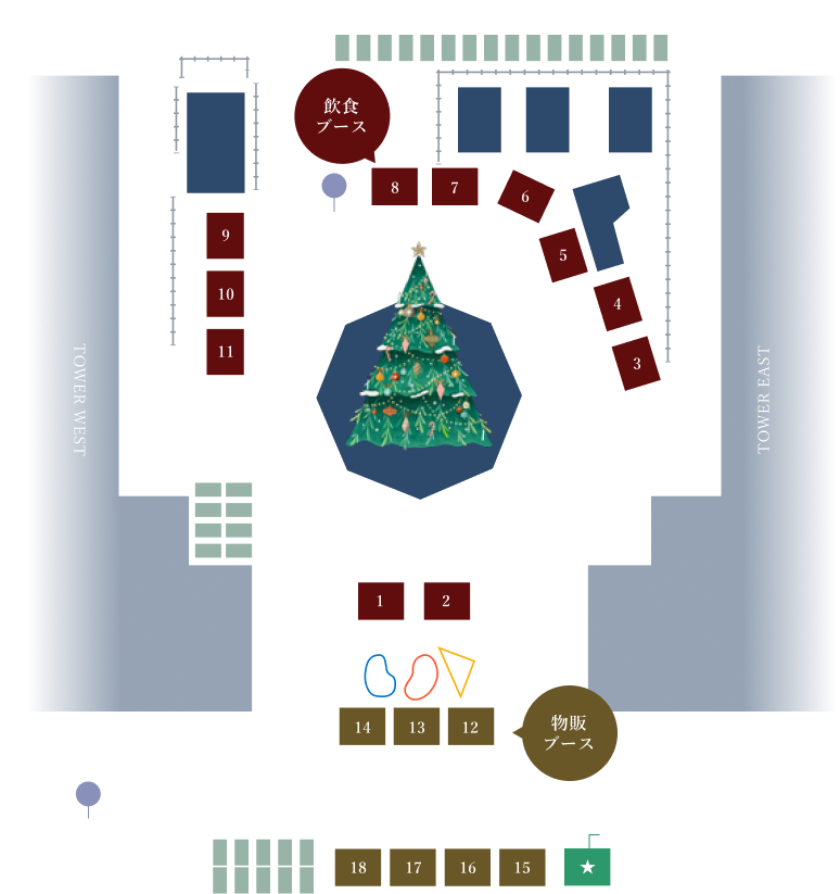 光り輝くシンボルツリーの周りには、クリスマスならではのお土産や飲食の小屋が立ち並びます。