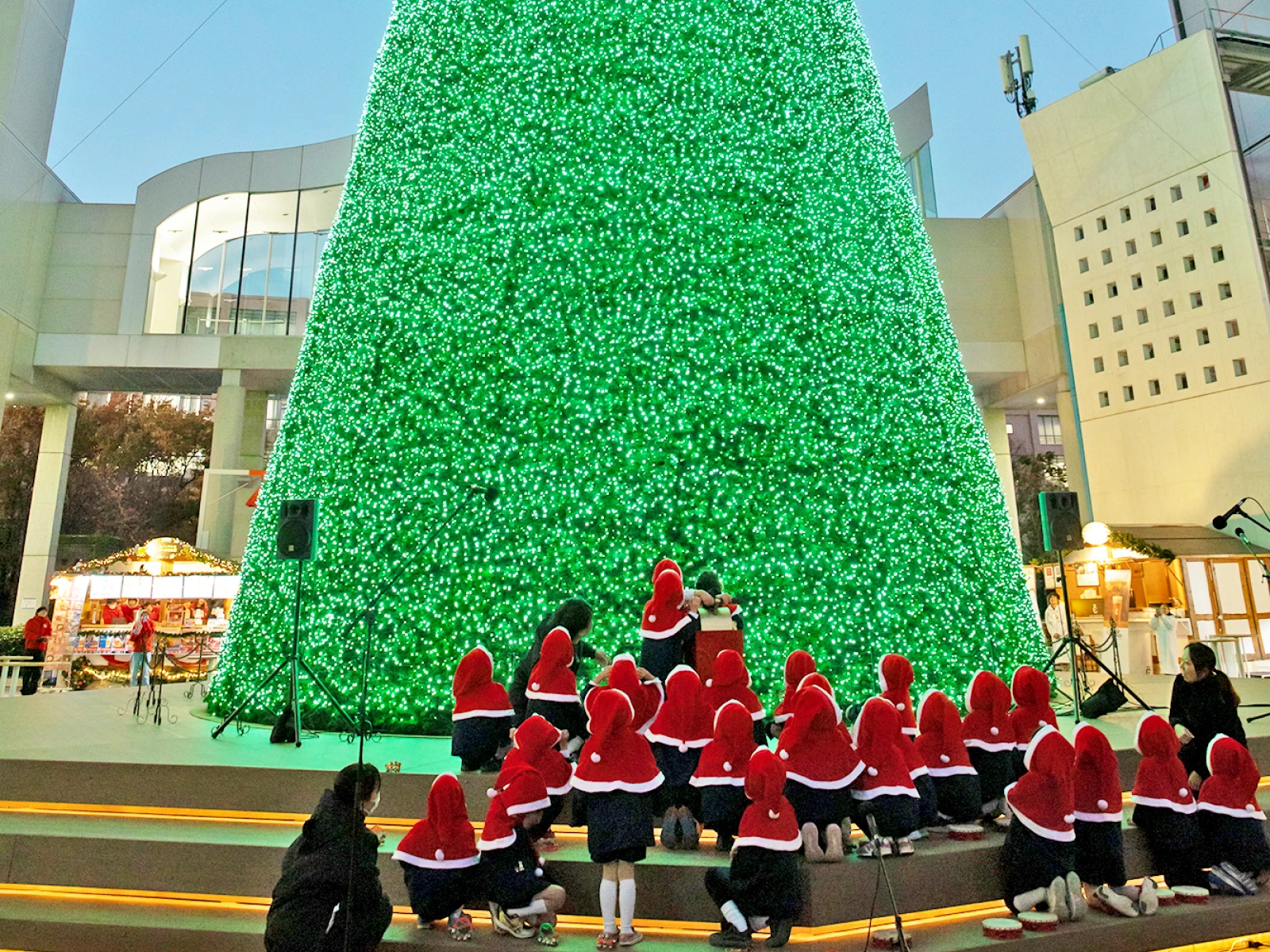 広場中央にそびえたつのは、高さ25m、約13万球のLEDに覆われた圧巻のクリスマスツリー。