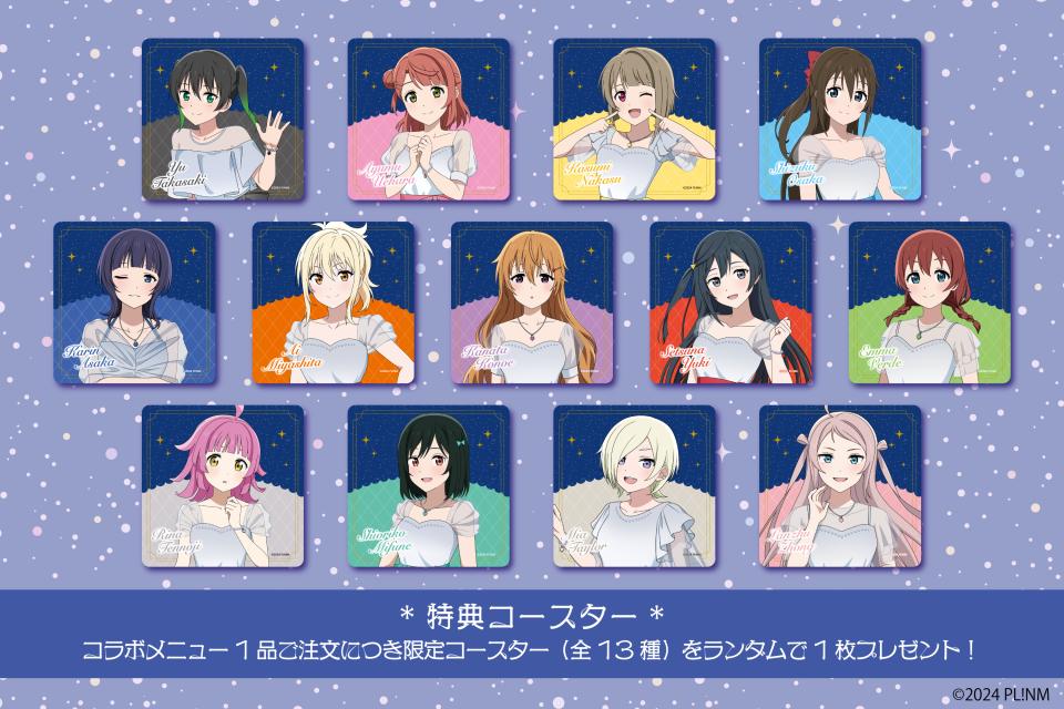コラボメニューを一点ご購入いただくと、コラボ限定コースター(全13種)をランダムで1枚プレゼントいたします。