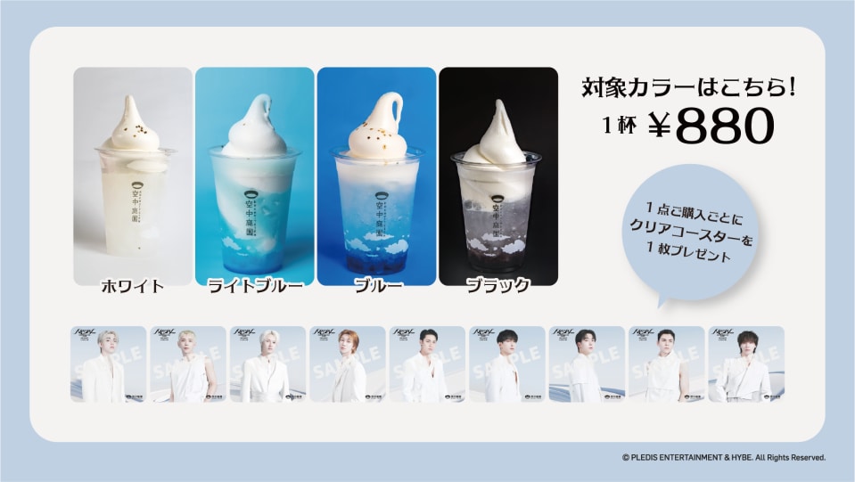 展望台内のカフェにて、対象カラーのカラーポップソーダフロート(880円)をお買い上げいただいたお客様には、購入特典としてクリアコースター(全9種からランダム配布)を1枚プレゼント!